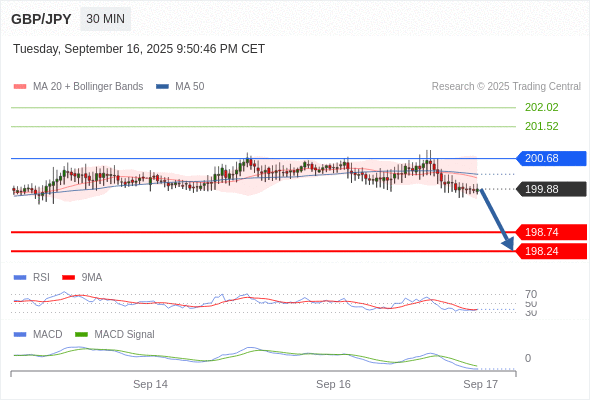英镑/日元 当日内: 看跌,在 200.68 之下。