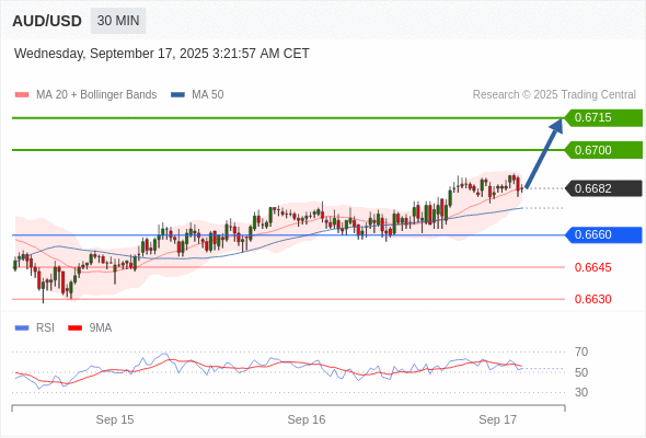 在 0.6660 之上,看涨,目标价位为 0.6700 ,然后为 0.6715 。