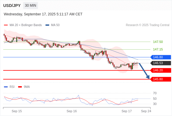 在 146.80 之下,看跌,目标价位为 146.20 ,然后为 145.80 。