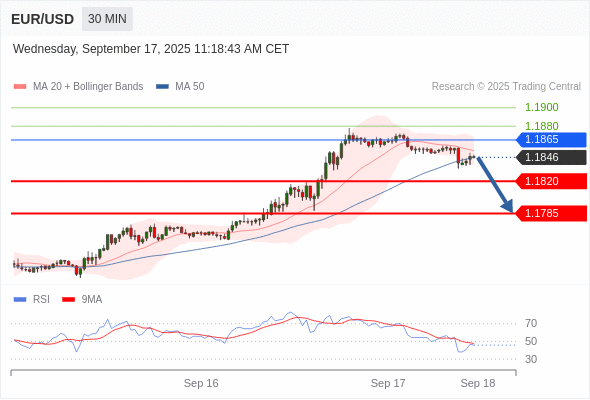 交易策略: 在 1.1865 之下,看跌,目标价位为 1.1820 ,然后为 1.1785 。