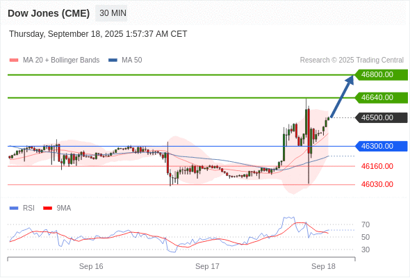 美国道琼斯指数期货 (Z5) 当日内: 目标位为46800.00。