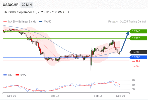 美元/瑞郎 当日内: 在0.7865之上,看涨。
