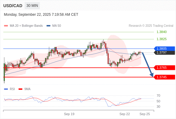 在 1.3805 之下,看跌,目标价位为 1.3765 ,然后为 1.3745 。