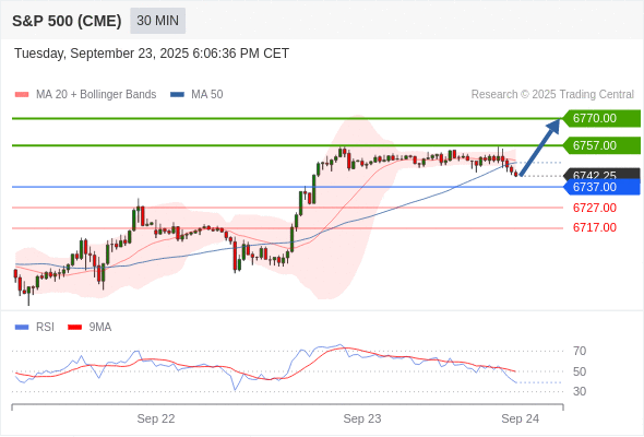在 6737.00 之上,看涨,目标价位为 6757.00 ,然后为 6770.00 。
