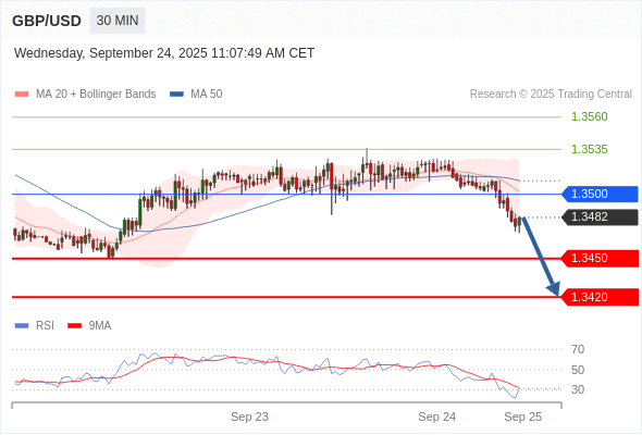 在 1.3500 之下,看跌,目标价位为 1.3450 ,然后为 1.3420 。