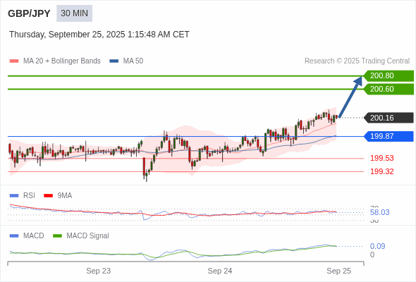 英镑/日元 当日内 : 看涨,当 199.87 为支撑位,目标定在200.80。