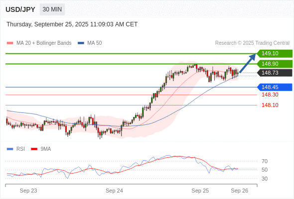 在 148.45 之上,看涨,目标价位为 148.90 ,然后为 149.10 。