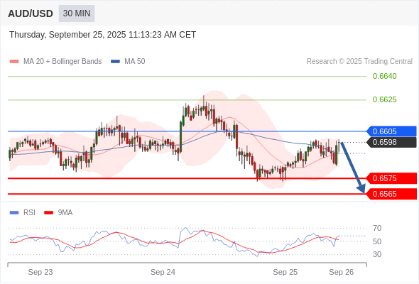 在 0.6605 之下,看跌,目标价位为 0.6575 ,然后为 0.6565 。