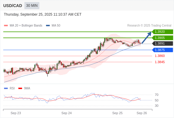 在 1.3875 之上,看涨,目标价位为 1.3905 ,然后为 1.3920 。