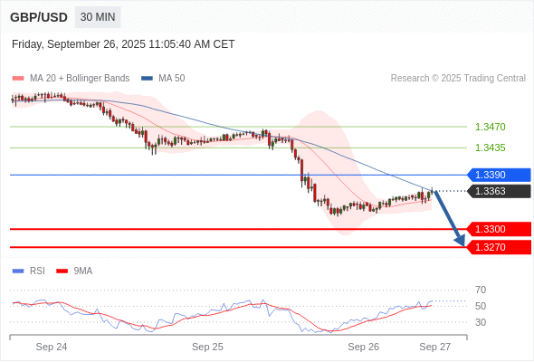交易策略: 在 1.3390 之下,看跌,目标价位为 1.3300 ,然后为 1.3270 。