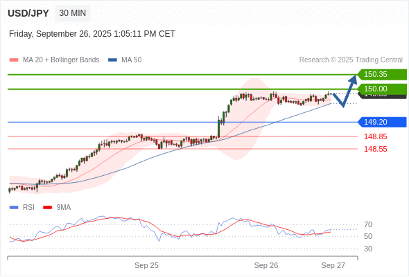 在 149.20 之上,看涨,目标价位为 150.00 ,然后为 150.35 。