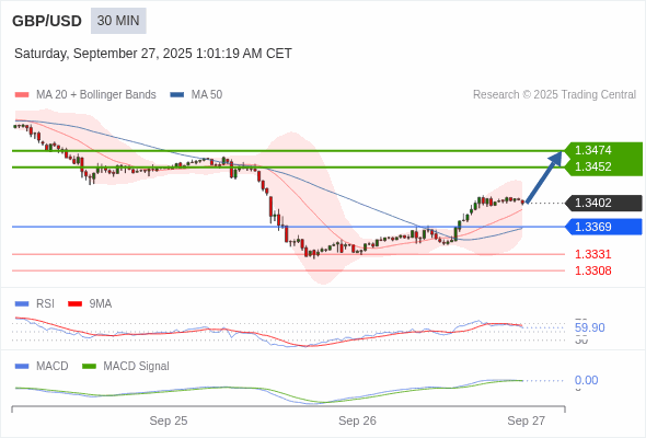 英镑/美元 当日内 : 看涨,当 1.3369 为支撑位,目标定在1.3474。