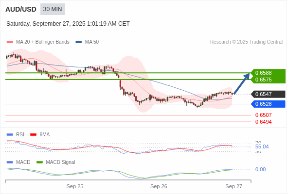 澳元/美元 当日内 : 看涨,当 0.6528 为支撑位。