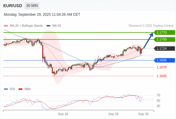 在 1.1690 之上,看涨,目标价位为 1.1750 ,然后为 1.1770 。