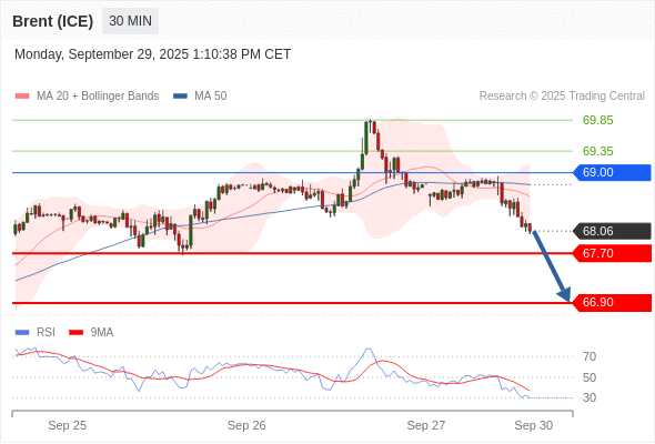 在 69.00 之下,看跌,目标价位为 67.70 ,然后为 66.90 。