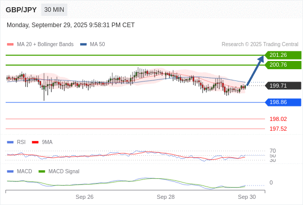 备选策略: 如跌破 198.86 ,GBP/JPY 目标方向定在 198.02 和 197.52 。