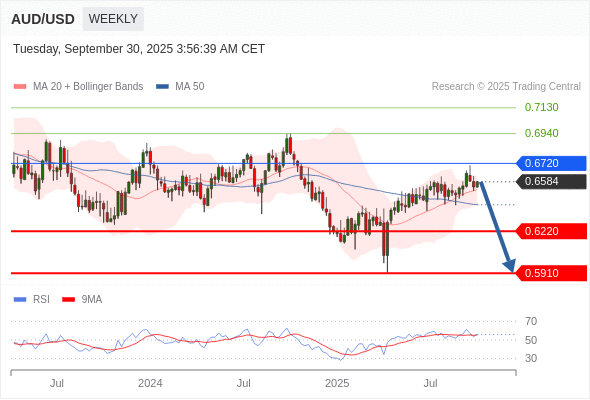 交易策略: 在 0.6720 之下,看跌,目标价位为 0.6220 ,然后为 0.5910 。