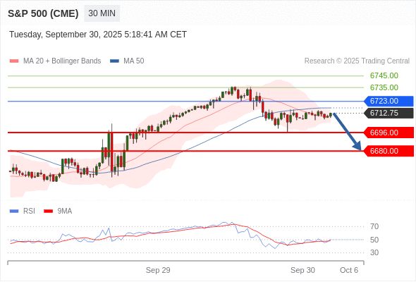 在 6723.00 之下,看跌,目标价位为 6696.00 ,然后为 6680.00 。