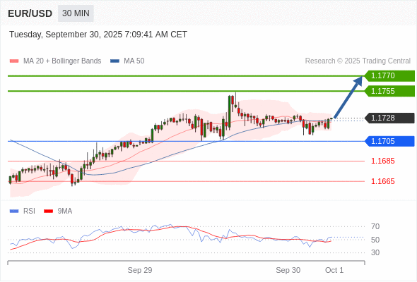 在 1.1705 之上,看涨,目标价位为 1.1755 ,然后为 1.1770 。