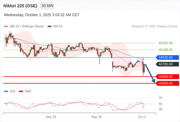 在 44930.00 之下,看跌,目标价位为 44500.00 ,然后为 44350.00 。