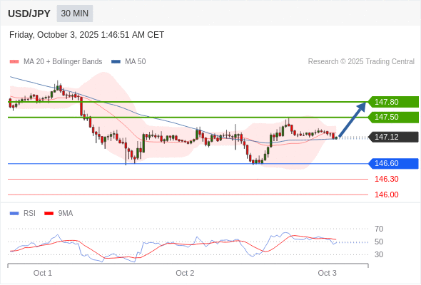 在 146.60 之上,看涨,目标价位为 147.50 ,然后为 147.80 。