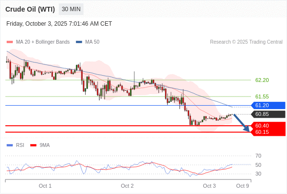 在 61.20 之下,看跌,目标价位为 60.40 ,然后为 60.15 。