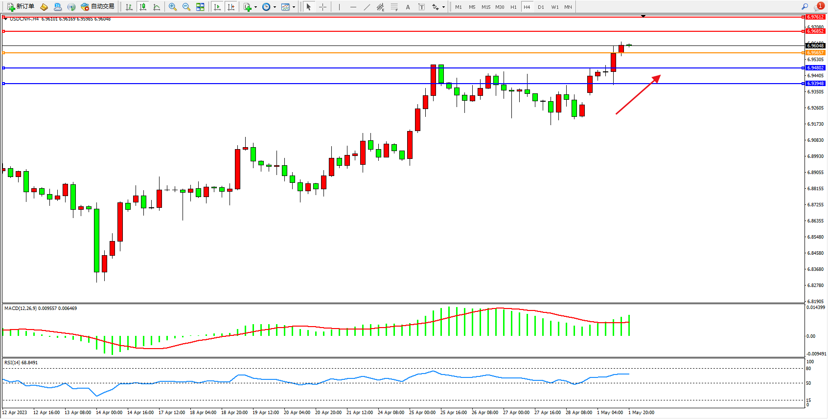 美元人民币USDCNH——4小时K线图显示: