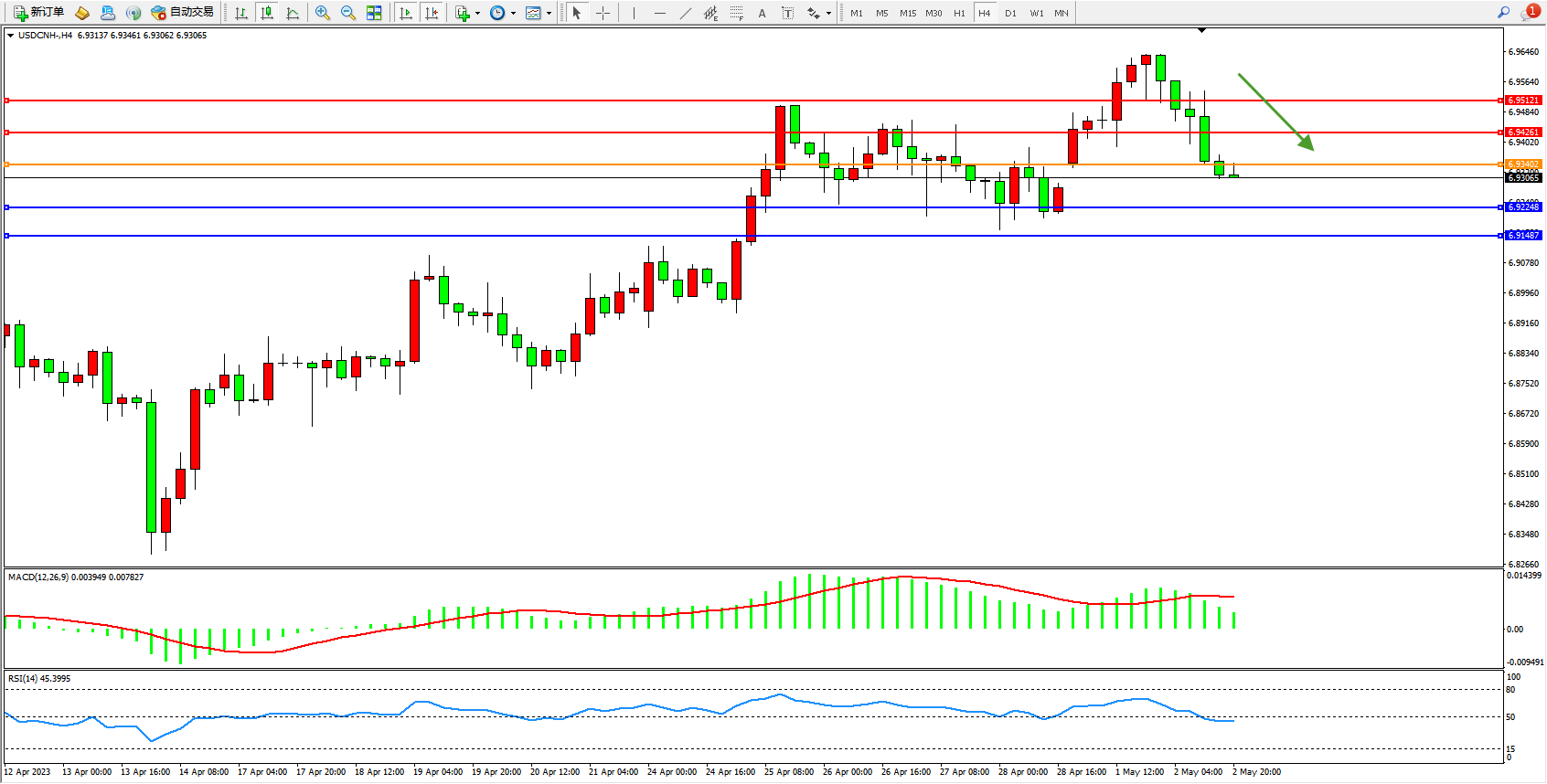 美元人民币USDCNH——4小时K线图显示: