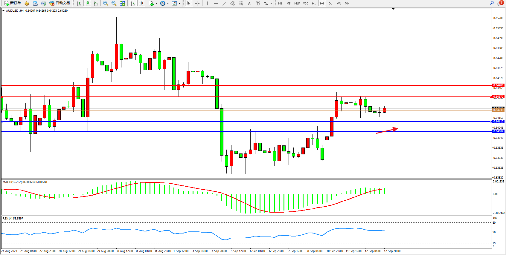 交易策略:0.64230上方看涨,目标0.64370  0.64488