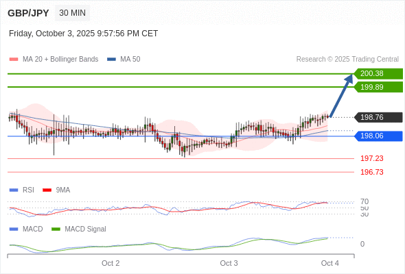 英镑/日元 当日内: 看涨,当 198.06 为支撑位。