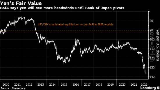 日元兑美元汇率目前接近24年低点,美国银行策略师Myria Kyriacou在周五的报告中表示,在基于基本面的行为均衡汇率模型中,日元与其公允价值的偏差突出。虽然美元兑日元目前报135.25日元,但美国银行估计均衡水平在90.74日元,也就是日元应当比现在高49%左右。